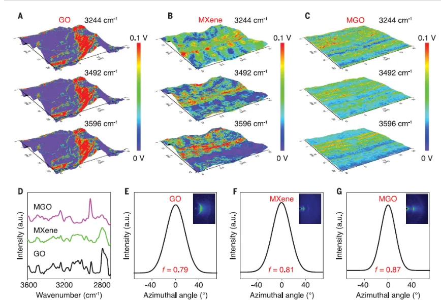 為了深入了解氧化石墨烯(GO)、MXene和MXene橋接氧化石墨烯(MGO)片的結(jié)構(gòu),研究者主要利用布魯克的納米紅外光譜儀來(lái)表征納米受限水在MXene和氧化石墨烯納米片上的分布情況。如圖2展示了這些片的AFM-IR化學(xué)圖像、紅外吸收光譜和WAXS數(shù)據(jù)。首先,通過(guò)AFM-IR技術(shù),研究者獲得了GO、MXene和MGO片的化學(xué)分布的空間模式。在圖2A至圖2C中,分別展示了GO、MXene和MGO片在不同紅外頻率下的化學(xué)分布。這些圖像揭示了水在不同片中的聚集和分布狀態(tài)。通過(guò)分子動(dòng)力學(xué)模擬,研究者成功地確定了體相水和界面水的位置,為后續(xù)研究提供了基礎(chǔ)(見(jiàn)圖a)。其次,圖2D顯示了GO、MXene和MGO片的紅外吸收光譜。在光譜中,研究者觀察到在3244、3492和3596 cm?1處的峰分別對(duì)應(yīng)于體相水、弱氫鍵相互作用的界面水和界面水的懸掛氫氧基。這些峰的出現(xiàn)表明不同水狀態(tài)在片中的存在,進(jìn)一步支持了AFM-IR圖像的觀察結(jié)果。最后,通過(guò)WAXS數(shù)據(jù),研究者研究了GO和MGO片的晶體結(jié)構(gòu)。圖2E至圖2G展示了入射Cu-KαX射線束平行于片平面的WAXS數(shù)據(jù)。通過(guò)方位掃描輪廓,研究者記錄了GO和MGO片中(001)和MXene片中(002)峰的信息。這些數(shù)據(jù)進(jìn)一步證明了MGO片中水的連續(xù)分布,以及MXene和GO納米片的有序排列。