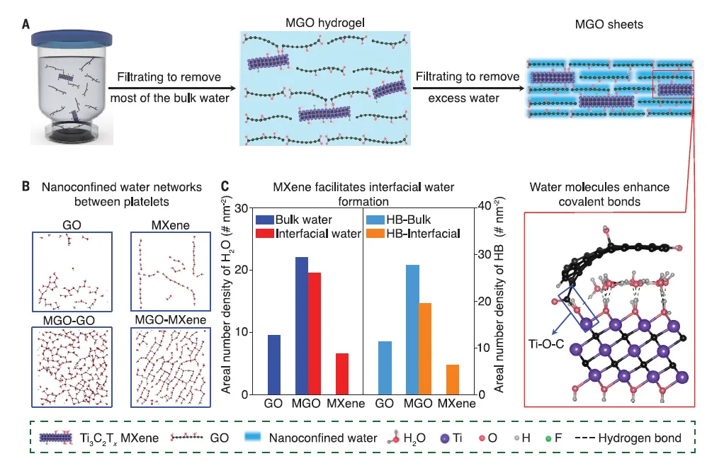 為了解決二維納米材料在制備過(guò)程中的排列和緊密度問(wèn)題,研究者在圖1展示了利用納米限域水制備排列一致的MXene橋接氧化石墨烯(MGO)片的過(guò)程和結(jié)構(gòu)。首先,圖1A是MGO水凝膠和MGO片的制備過(guò)程。研究者將MXene和氧化石墨烯納米片混合在室溫水中,形成MXene橋接的GO(MGO)納米片,通過(guò)Ti-O-C共價(jià)鍵連接。DFT計(jì)算顯示MGO片中MXene和GO的原子結(jié)構(gòu),表明它們通過(guò)共價(jià)鍵橋接(見(jiàn)圖a)。在連續(xù)真空過(guò)濾過(guò)程中,MXene和GO納米片之間形成了被限制在納米通道中的水分子層,使得MGO片具有高度排列一致的結(jié)構(gòu)。其次,圖1B展示了GO、MXene和MGO片中水和氫鍵的配置,通過(guò)分子動(dòng)力學(xué)模擬得到。結(jié)果顯示,MGO片中的界面水密度要遠(yuǎn)高于GO片,表明MXene的存在促使了水分子在MGO片中的高密度排列(見(jiàn)圖b)。最后,圖1C顯示了GO、MXene和MGO片中水分子和氫鍵的面積數(shù)密度。結(jié)果表明,在MGO片中,界面水的形成要求不僅需要納米限域通道,還需要MXene的存在,而且MGO片中的水含量比毛細(xì)干燥的CMGO片要高(見(jiàn)圖c)。所以,通過(guò)利用納米限域水,研究者成功地制備了排列一致、具有高密度的MXene橋接氧化石墨烯片,解決了二維納米材料在制備過(guò)程中常見(jiàn)的排列和緊密度問(wèn)題。