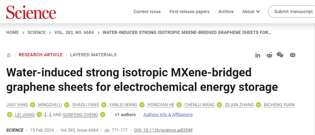 為解決以上問(wèn)題,程群峰教授和美國(guó)德克薩斯大學(xué)達(dá)拉斯分校Ray H. Baughman教授等科學(xué)家在研究中探索了利用水分子在真空過(guò)濾過(guò)程中形成有序、延伸的平面氫鍵網(wǎng)絡(luò),以實(shí)現(xiàn)高度排列和防止毛細(xì)收縮的可能性。通過(guò)使用類似尺寸的氧化石墨烯和Ti3C2Tx MXene納米片,科學(xué)家進(jìn)行了研究,并采用了氫碘酸和π-π橋接等技術(shù),制備了高度排列、平面各向同性的MXene橋接石墨烯片(πBMG)。通過(guò)在真空過(guò)濾過(guò)程中引入水分子,形成有序、延伸的平面氫鍵網(wǎng)絡(luò),科學(xué)家成功地防止了納米片的毛細(xì)收縮,并實(shí)現(xiàn)了高度排列。在經(jīng)過(guò)氫碘酸和π-π橋接等處理后,他們獲得了強(qiáng)度各向同性的πBMG片。這項(xiàng)研究的成果為制備高性能二維納米材料提供了新的方法,解決了濕化學(xué)方法中常見(jiàn)的結(jié)構(gòu)缺陷和力學(xué)性能下降的問(wèn)題。相關(guān)成果在Science頂刊發(fā)題為“Water-induced strong isotropic MXene-bridged graπhene sheets for electrochemical energy storage.”的研究論文,引起了不小的關(guān)注。