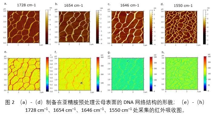 作者采用亞精胺和Ni2+預處理云母表面,隨后沉積DNA分子結構,采用納米紅外光譜技術分別對兩種DNA分子結構進行納米尺度化學表征。