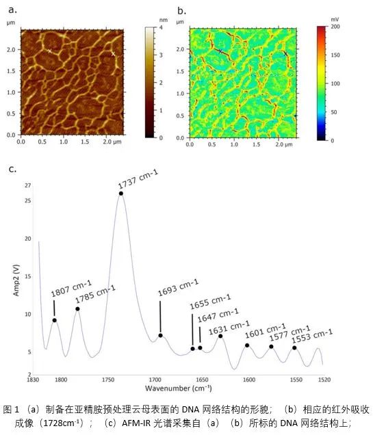 作者首次使用AFM-IR以超高的空間分辨能力和靈敏度成功表征了DNA網絡結構和單個DNA分子的納米光譜和吸收成像。作者認為,AFM-IR納米光譜技術可以成為化學修飾DNA和核蛋白復合物的光譜和成像表征的有效方法。