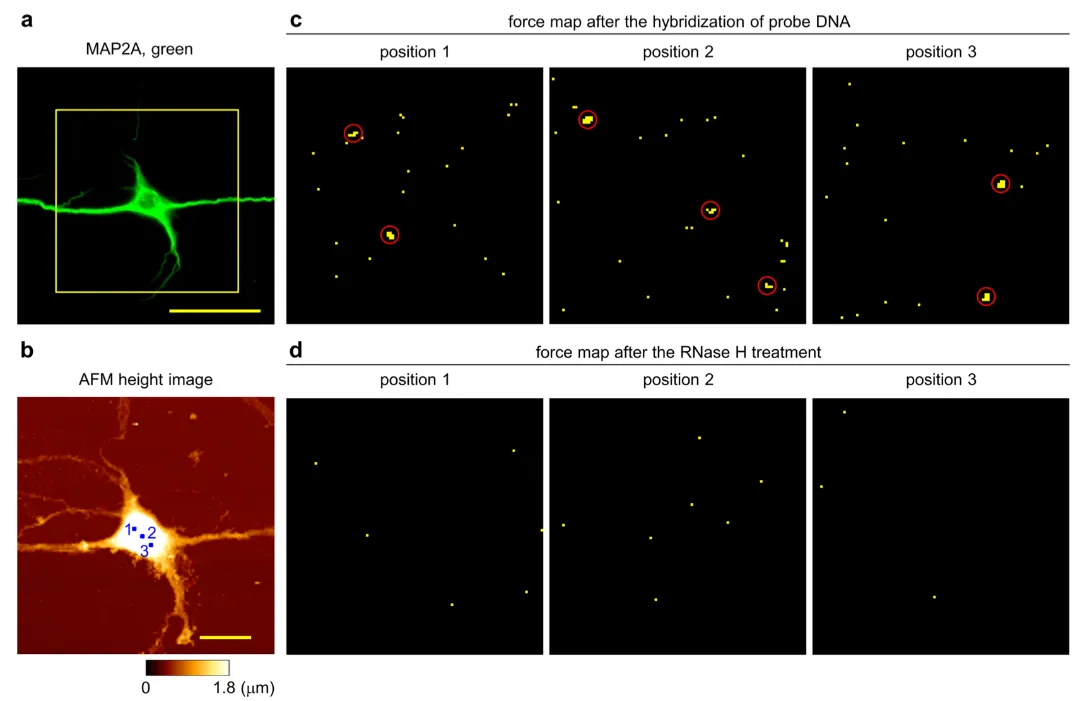 圖4 在固定的神經(jīng)元上繪制miR-134分布。(a)海馬神經(jīng)元(DIV7),MAP2;綠色。(b)a中的方框區(qū)域進行原子力顯微鏡成像。(c)b中編號的區(qū)域在與miR-134互補DNA雜交后進行粘附力實驗。(d)相同的區(qū)域在用相同的探針進行RNase H處理后重新測試,未觀察到團簇。(c, d)黃色像素表示在五次測量中觀察到特定粘附力超過一次的位置(100 × 100像素,1.0 × 1.0 μm2)。a中的比例尺為50 μm,b中的比例尺為20 μm。