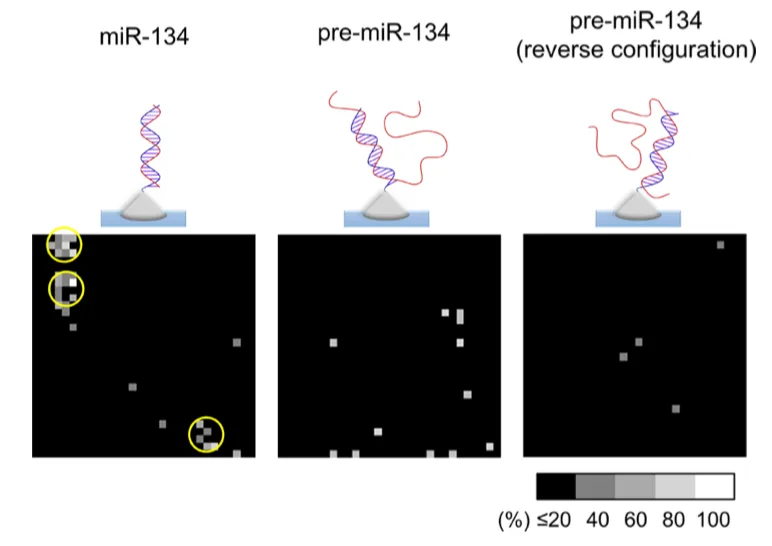 作者將N末端的人RNase H1蛋白通過表面修飾的方法固定在原子力顯微鏡針尖上。這種蛋白可以結合RNA/DNA雜交雙鏈,稱為雜交結合域(hybrid binding domain, HBD),在這里作者使用結構更穩(wěn)定的DNA探針而不是RNA來檢測mRNA。在實驗中,修飾后的探針用于檢測一種腦特異性miRNA,miR-134。這是一種能夠調節(jié)脊椎生長和樹突生成的腦特異性miRNA。