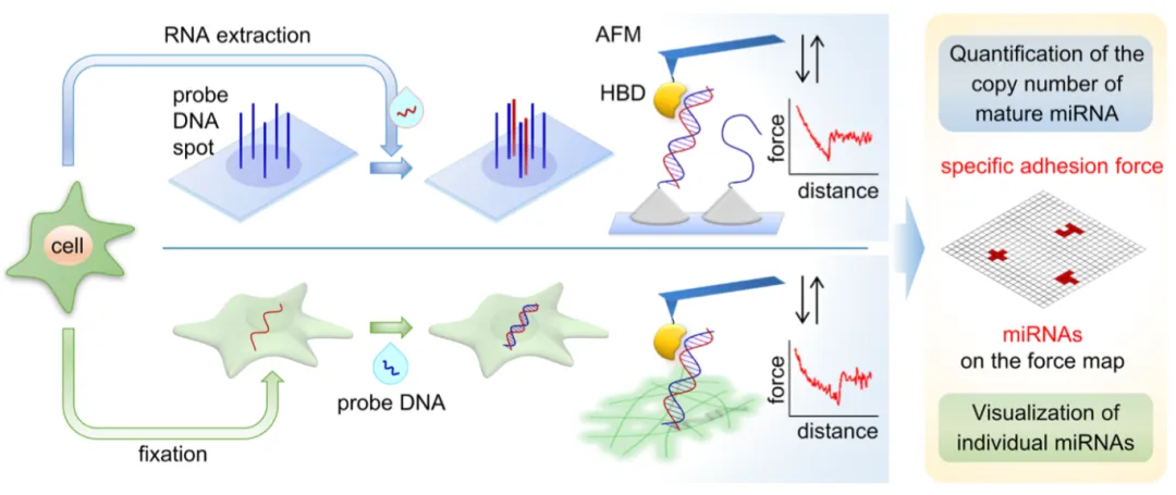 圖1 上半部分:為了定量化檢測特定miRNA,從單個細胞中提取總RNA,并使目標miRNA與探針DNA點雜交;下半部分:在固定的單個細胞上繪制特定miRNA的原位分布,并使探針DNA與固定的miRNA雜交。利用連接HBD的原子力顯微鏡探針產(chǎn)生的力-距離力曲線中的特定粘附力來識別miRNA/DNA雜交物。單個的miRNA/DNA雜交物在粘附力圖上呈現(xiàn)為一簇像素。實驗方法