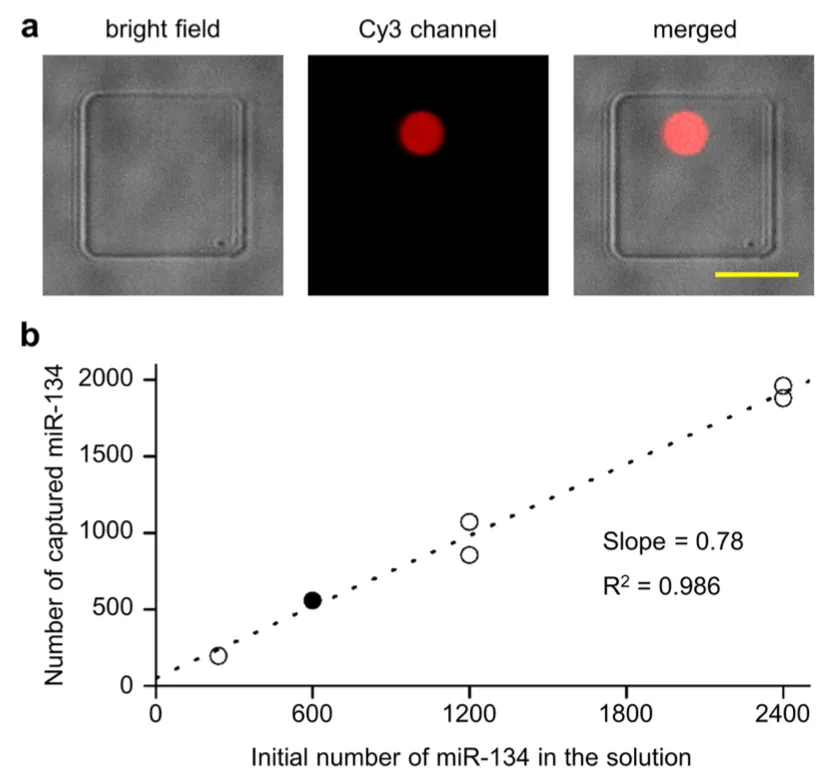 圖3 DNA斑點上的miR-134。(a)在方格圖案化的玻璃片上生成的探針DNA(在3'端修飾Cy3)斑點的共聚焦顯微鏡圖像。比例尺,10 μm。(b)在單獨的DNA斑點上檢測10-100 aM(240-2400個拷貝)的miR-134(30 × 30像素,300 × 300 nm^2)。觀察到特異性miR-134力曲線數(shù)量與樣品溶液中miR-134的初始數(shù)量之間呈線性相關,并且從線性回歸的斜率計算出捕獲效率為78%。(一個實心圓表示兩個數(shù)據(jù)點重疊。)