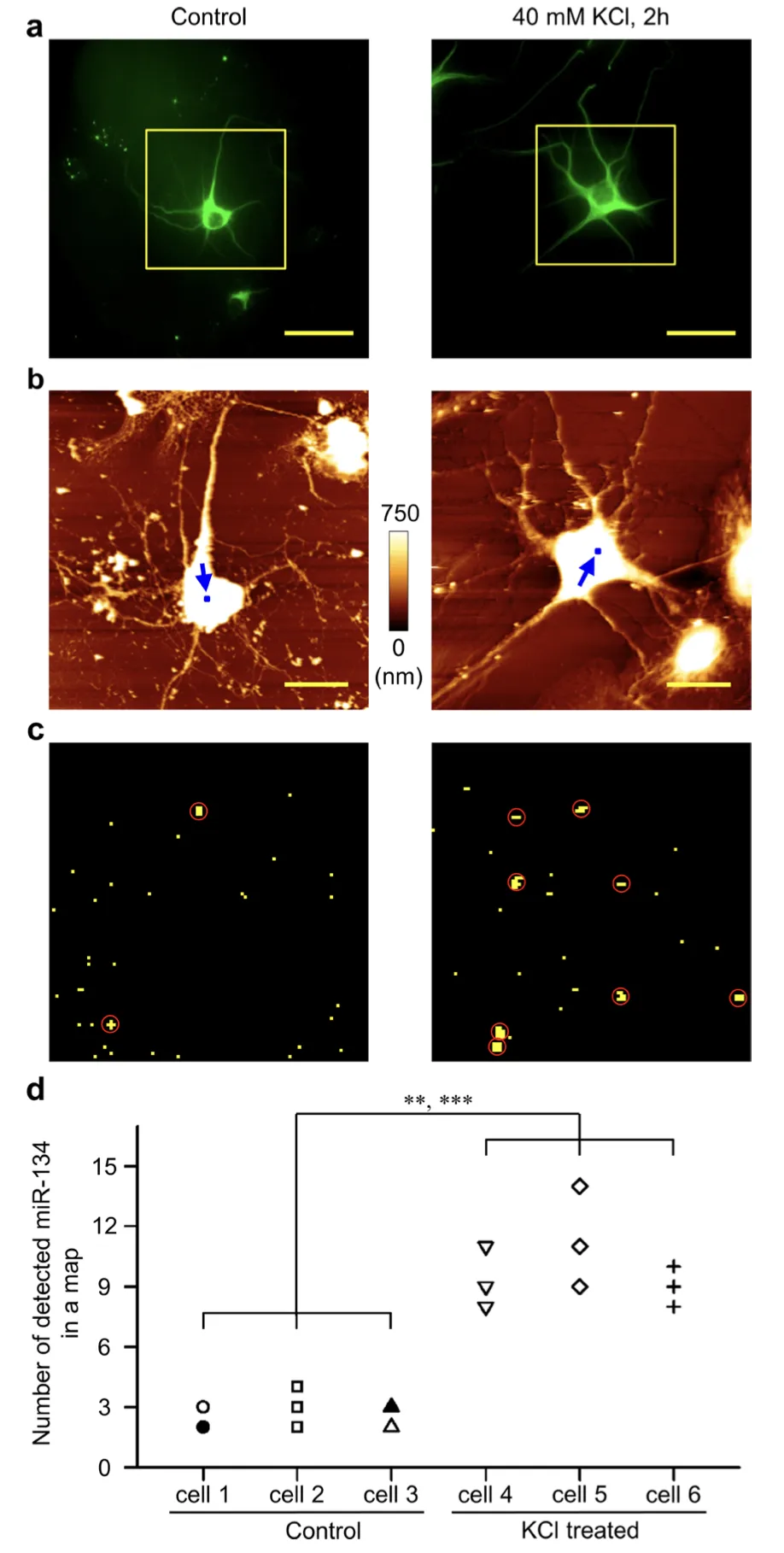 圖5 神經(jīng)元細胞通過膜去極化誘導增強表達miR-134。(a)未受刺激的海馬體DIV7細胞與在固定前經(jīng)過40 mM KCl 2小時刺激的細胞。二者均經(jīng)過MAP2免疫染色。(b)原子力顯微鏡圖像。a比例尺50 μm,b比例尺20 μm。(c)在神經(jīng)元體上隨機位置測試得到的粘附力圖像。測試位置在b中用藍色箭頭標注。(100 × 100像素,1.0 × 1.0 μm2)特異性粘附力產(chǎn)生概率超過20%的區(qū)域用黃色標注,團簇用紅色圓圈標注。(d)在三個神經(jīng)細胞上分別進行了三個不同位置的miR-134團簇檢測。1.Visualization and Quanti?cation of MicroRNA in a Single Cell Using Atomic Force Microscopy